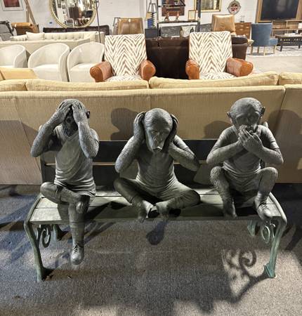 3 Bronze Monkeys “See No, Hear No, Speak No” on Bench 53”x 32”x 36” h Excellent Condition