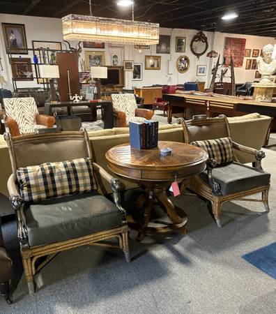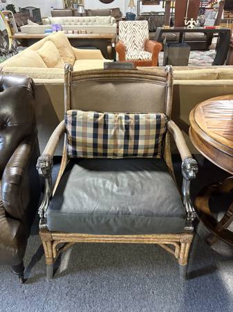 Pair of Maitland Smith Rattan and Leather Chairs with Lion Accents 49.5” x 32” x 32” Excellent Condition