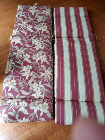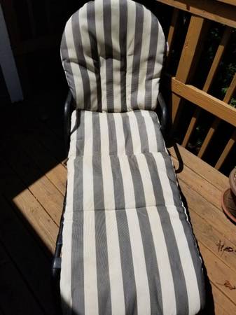 2 outdoor lightweight loungers with adjustable headrest. One in very good condition. The other one has a broken strap (see picture). The set comes with 4 cushions. One of the black cushion has a small and a larger tear (see pic). The second set of cushions are double sided. One side has floral pattern the other side has stripes one in very good condition.