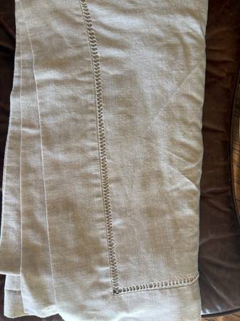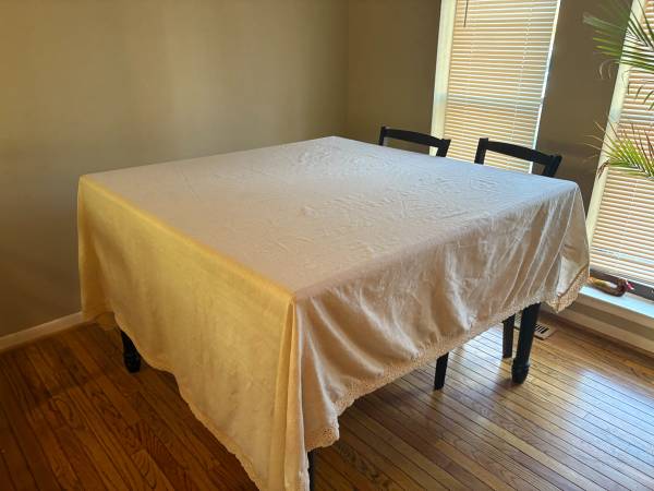 Lower price negotiable for TABLE WITHOUT TABLECLOTHS ($175), or if only interested in table cloths (asking $50 for each linen tablecloth, $15 for each linen blend tablecloth.)