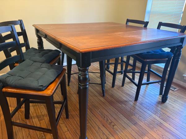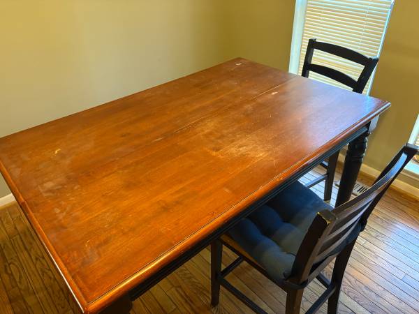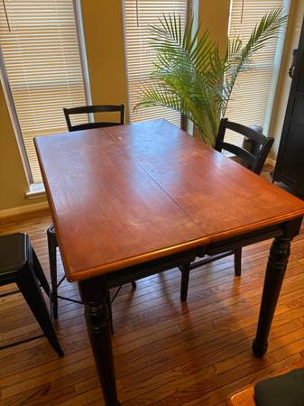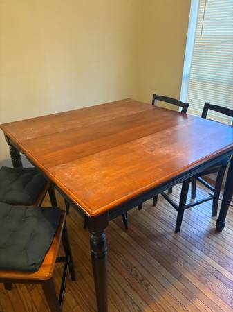 Solid wood counter height (36" high) table with painted black legs and cherry-stained wood top. 54" x 36" tabletop without leaf; 54" square with leaf inserted.