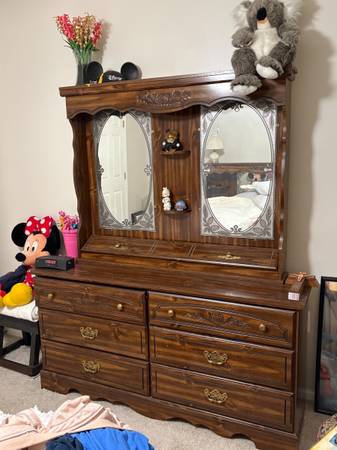 dresser: 29.5 inches high, 36.5 inches deep and 60 inches wide - the mirror adds 40.5 inches to the height. The mirrored section is 48.5 inches wide.