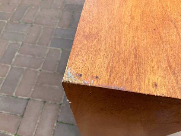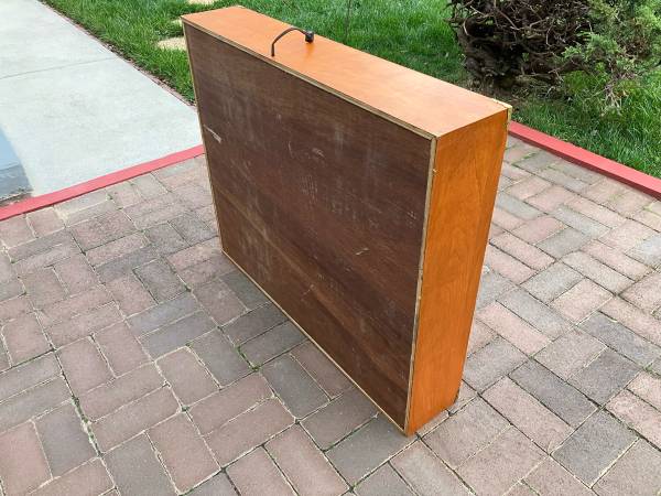 Mid-century open-faced wood wall shelf cabinet. Outer dimensions: 6-3/4" L x 36" W x 30" H Shelves are 6-1/4" deep. See images. Small amount of wear on left side top edge, center top right edge, and...