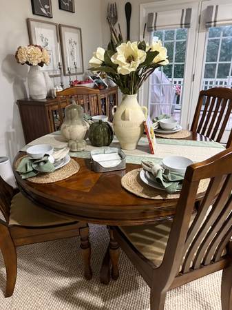Dining room set 6 pcs .Round table with 4 hairs and server bar. All solid wood. Brand new condition. Price $950.