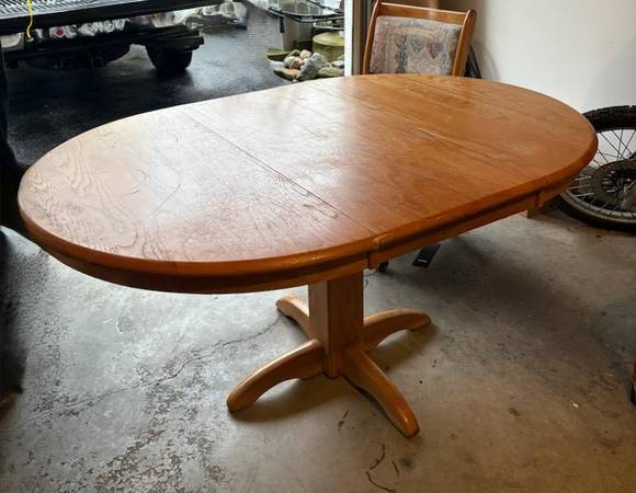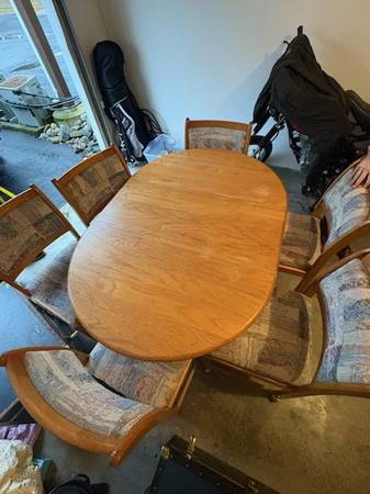 Wood dining table with 6 chairs on wheels. Chairs in great shape.