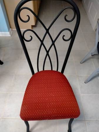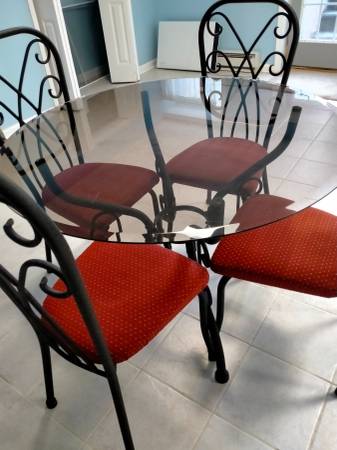 GLASS TOP WROUGHT IRON DINING TABLE EASY TO MOVE NO ASSEMBLY REQUIRED STURDY BASE TABLE WITH 4 CHAIRS Glass Radius 44" Asking $550 will consider reasonable offer contact through email will get...