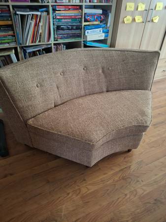 Enjoy this unique midcentury curved sofa/love seat, perfect for a reading nook or corner, one cushion, light brown material. Ready for your pick up. We are located right off I-70 in western Howard...
