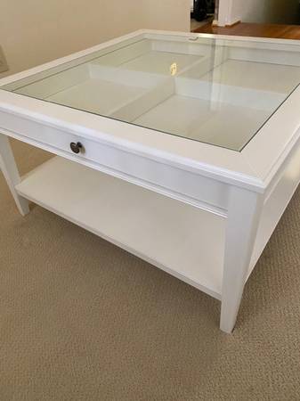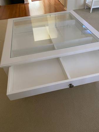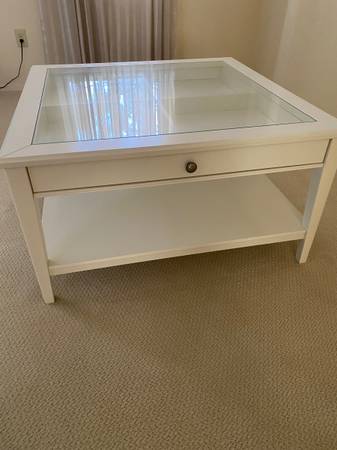 This is a nice Ikea Glass-top coffee table. The model name is Liatorp which I believe is not available from Ikea anymore. It has a drawer which pulls completely out. The dimensions are 37” square by...