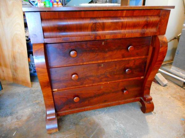 I've moved and need to downsize. I have a handsome Empire bureau which needs a new home. It's 2nd-half of the 19th-century, and in nice condition. It has 4 drawers. Drawers work smoothly. The bureau is mahogany, with very nice grain. (See drawer closeup.) I bought this piece from an estate in old Guilford about 30 years ago.