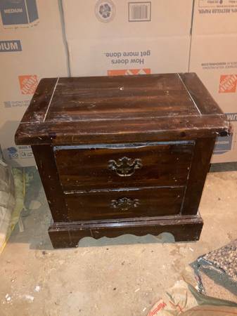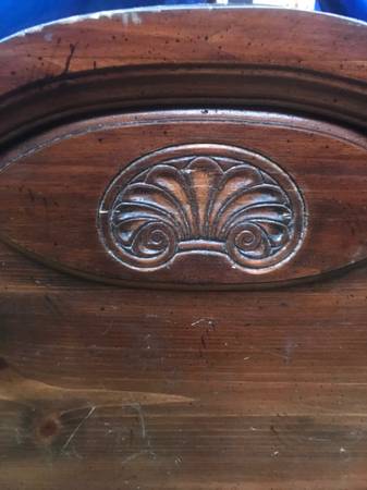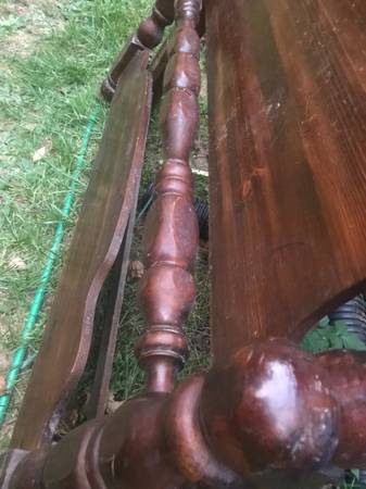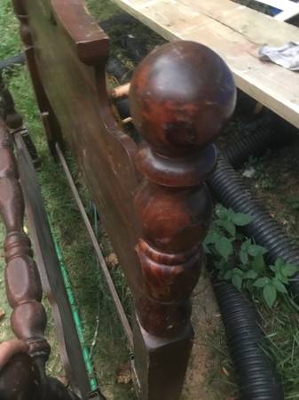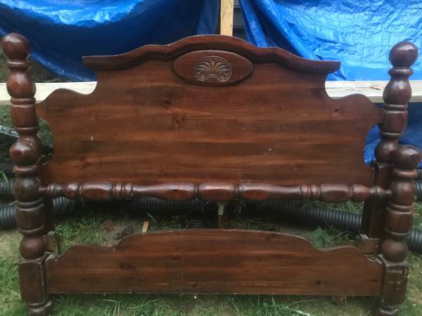 Complete solid wood bedroom set including double bed (headboard, footboard, and metal rails - no wood “slats” included), dresser, hutch/ mirror, and nightstand. This stuff is dusty from storage and the finish shows normal wear and tear but is otherwise in excellent condition. Totally usable as-is or refinish and restore.