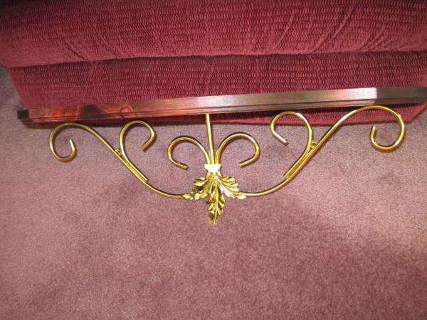 New Wood Decorative Shelf with gold accented design, complete with hangers. 23-1/2" long x 8" high x 6-1/2" deep (at widest section). $15 New in box. Cash only, "as is" and all sales final.
