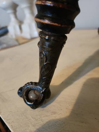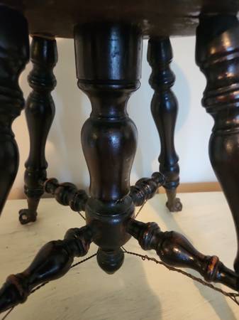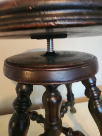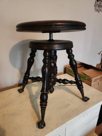 Beautiful antique solid wood piano stool with designer feet featuring ornate brass trim and glass ball. Seat spins up/down for height adjustment.