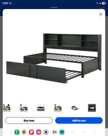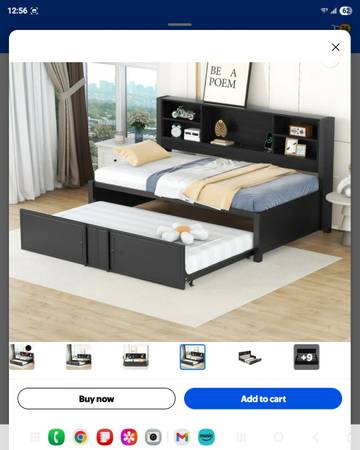 Daybed with bookcase headboard. Trundle bed underneath or could be used for storage. Light blue in color. Also has USB charger port. $175 OBO LESS THAN A YEAR OLD