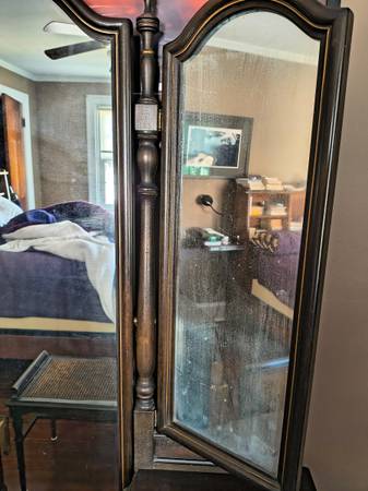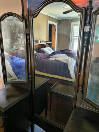 Beautiful 1920's bedroom vanity, solid wood (looks to be oak), good condition. Antique wooden castors. Trifold mirror set (two of which swing). Main mirror is clear; swing mirrors could be...