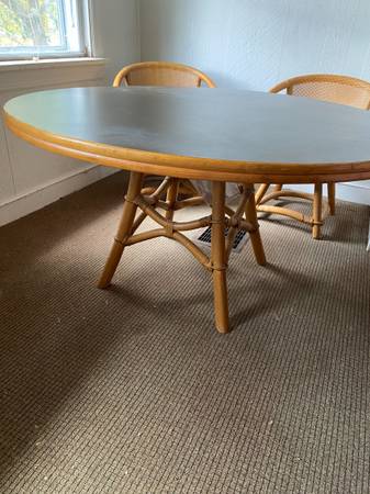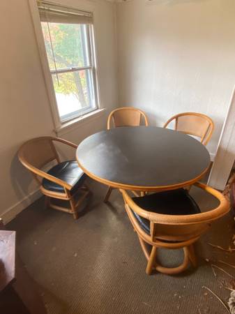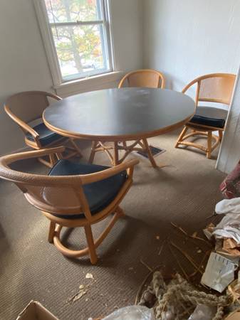 Fick's Reed has always been the gold standard for high end rattan furniture. Websites like Chairish and 1st Dibs list a pair of these chairs for $550 (plus freight). This set of very sturdy swivel chairs and 48" leather look formica top was made before 1975 and comes complete and ready to use.