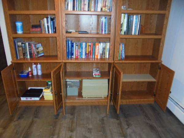 Three tasteful matching wooden bookshelves with lower enclosed area for extra storage. Dimensions: 29 1/2" x 72" x 12"each. Note: bottom open shelf is 13" deep. Configure each unit as you like or group together as we did. Asking $120 for the set. No Texts. Call or email. Thanks.