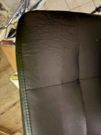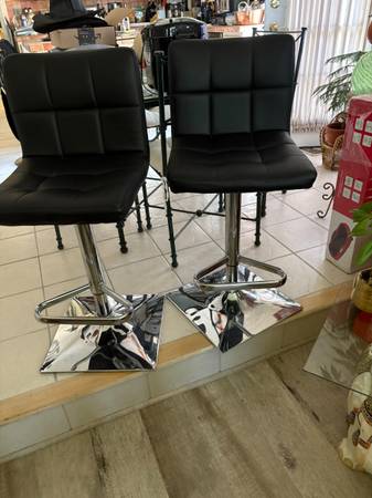 (2) Counter stools. Black leather seats on heavy swivel chrome base. One seat has 2 very small cracks in leather. Seats are replaceable. (2) stools for $30.00