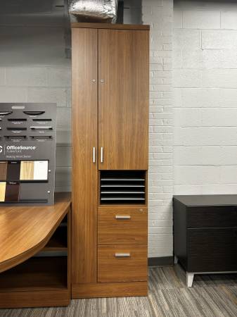 Zira storage cabinet with doors features two adjustable shelves and two file drawers that can accommodate legal and letter size filing. It includes a wardrobe compartment with a clothes hanger bar and is equipped with adjustable leveling glides for enhanced stability.