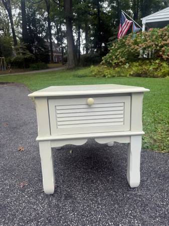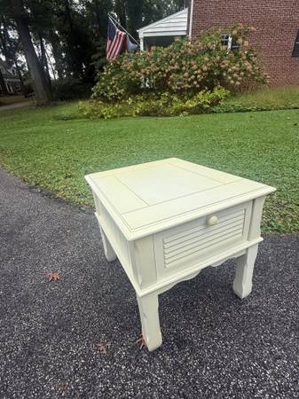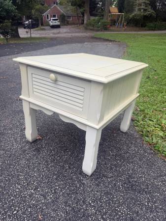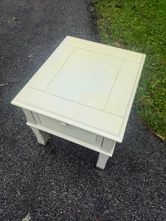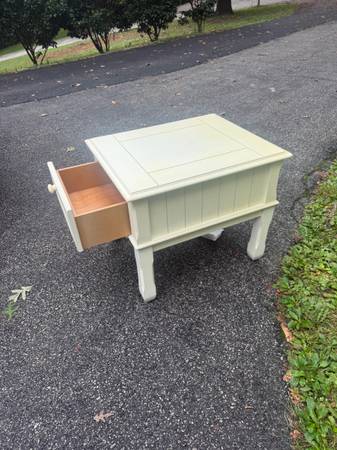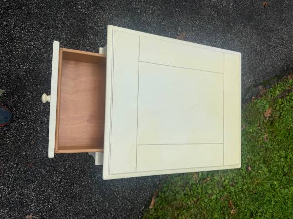 White wooden side table with single deep drawer; About 23in x 27in x 22.5in height, unknown maker; Cross posted, would deliver for a fee, no holds/FCFS; If you still see it, it's still for sale.