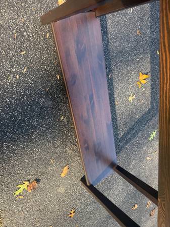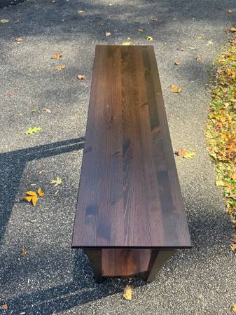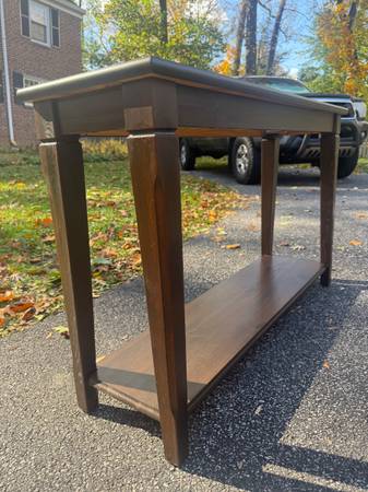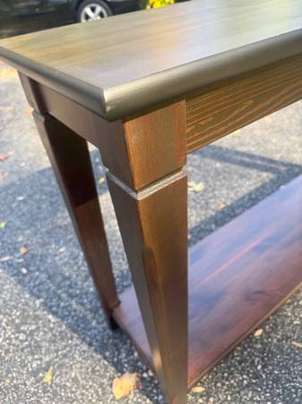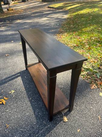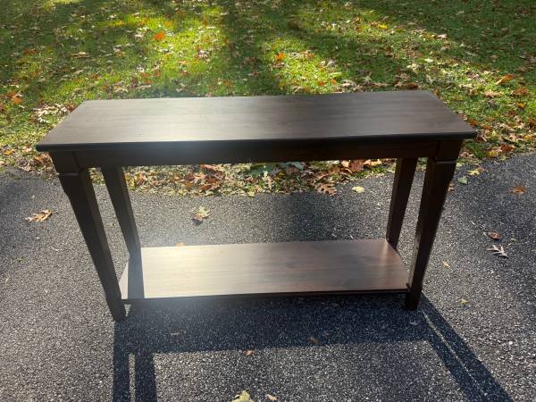 Mocha wooden console table with lower shelf; About 47in x 13in x 30in height, some nicks/scratches; Cross posted, would deliver for a fee, no holds/FCFS; If you still see it, it's still for sale.