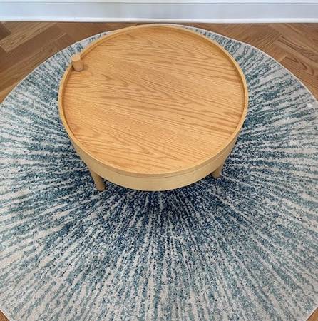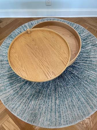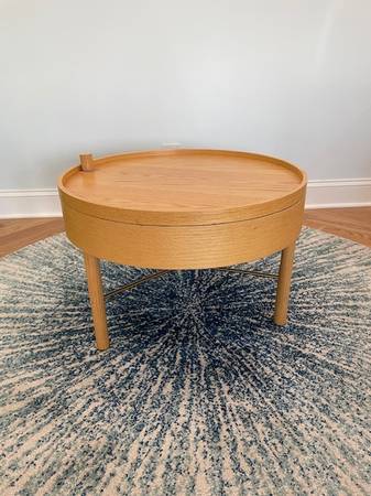 Mid-century style round solid white oak coffee table w/swing top for extra storage. This is perfect for a small space. Barley used so its in perfect condition. Selling only because I'm moving. New sells between $269 - $780.