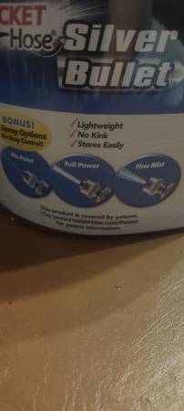 Brand New Pocket Hose Silver Bullet is the easy way to water your lawn. The expandable hose made from an exclusive biaxial braid outer shell. This seamless micromesh fabric prevents tearing so the garden hose wont tear or burst. Turn water on and watch Silver Bullet hose grow to a full size garden hose. Turn water off, and Silver Bullet hose shrinks itself dry to a compact Pocket Hose. There's no winding, no coiling, and no muddy wet messes. Silver Bullet has tough-grade silver connectors and no kink connector protectors that eliminate leaks. Unlike your old garden hose, Pocket Hose Silver Bullet can store easily on your shelf or in a drawer. Its super-lightweight so you can move it around your garden easily. Toss your old hoses away and get a Silver Bullet today.