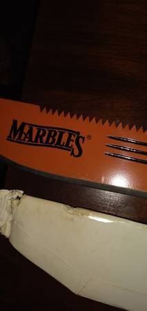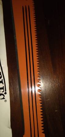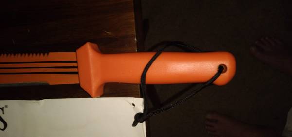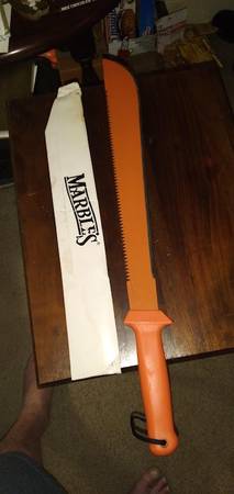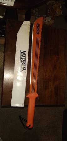 This sawback machete is 25" overall from tip to handle, with an orange poly prop handle 1075HC steel blade. This machete is ready to chop and saw whatever you need to. It is new and ready to go. $30