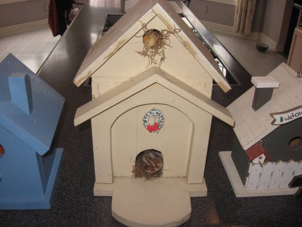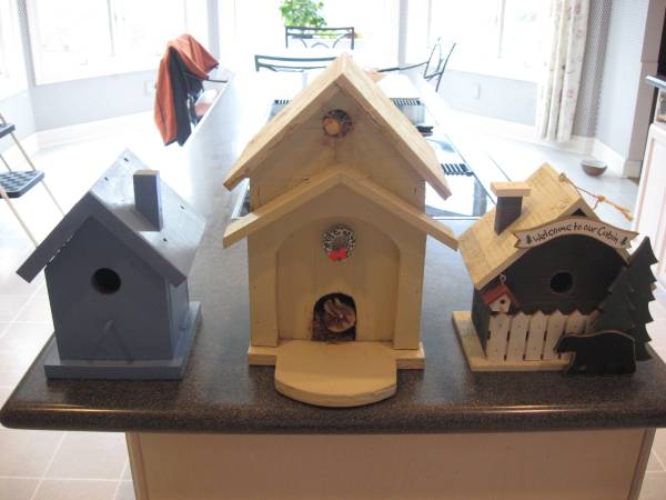 EACH 1 IS SOLD INDIVIDUALLY. THE SMALL BIRDHOUSE IS $15(ON THE LEFT)-NEVER BEEN OUTSIDE. THE LARGE BIRDHOUSE IS $40(IN THE MIDDLE) APPROXIMATELY 40 YEARS OLD-VERY GOOD CONDITION-IT HAS THAT LOOK. HOUSE ON RIGHT IS SOLD! show contact info
