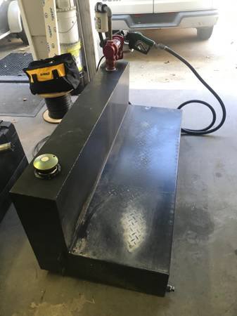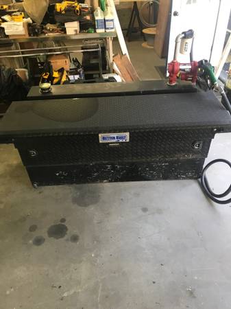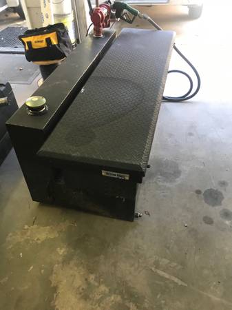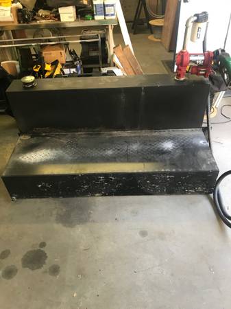 Custom Aluminum tank 90 Gallons with electric fuel pump.Black powder coated. Has a Better Built aluminum tool box that the tank was designed to fit around. Was installed on a 2015 GMC 2500 HD. Bolt...