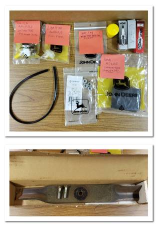 All parts are genuine John Deere and new except for the blades and one spark plug.