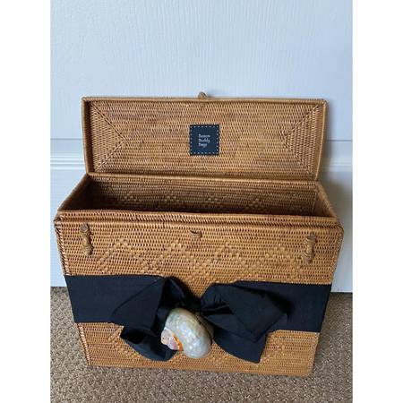 This is an exquisite handmade Asian rattan box with a black ribbon and bow wrap accent adorned with a wonderful mother of pearl conch like shell.