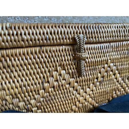 The very detailed woven rattan with intricate workmanship is embellished with a lovely slip through closure that keeps the lid closed.