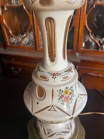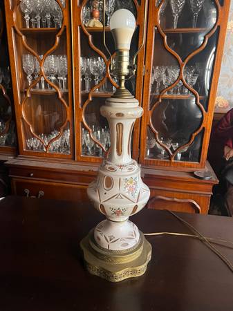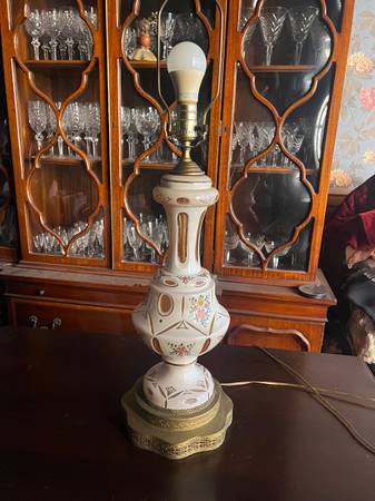 This is a beautifully detailed overlay lamp. Working condition. No shade (easily replaced by the buyer). This is a large lamp, approximately 30” tall. Amber glass, white overlay with flowers and gold detail.