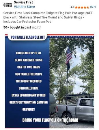 Service First Black Complete Tailgate Flag Pole Package 20FT Black with Stainless Steel Tire Mount and Swivel Rings - Includes Car Protector Foam Pad...NEW