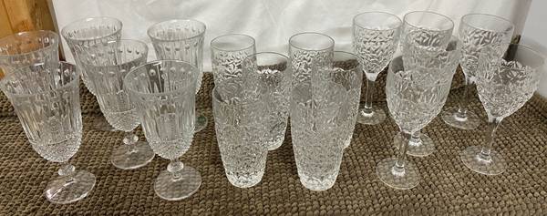 18 crystal glasses, including 6 each for iced tea, wine, and highball Perfect condition. Iced Tea glasses, Shannon crystal 7 ½ in. tall Wine glasses, Sasaki 7 ½ in. tall Highball glasses, Ice Cold...