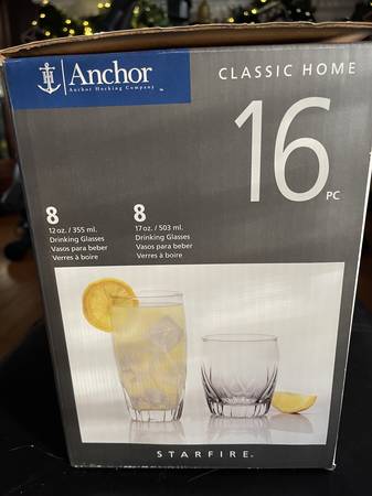 Anchor Starfire Classic Home 16 pc beverage set 8x12 oz and 8x17 oz drinking glasses. New in Box