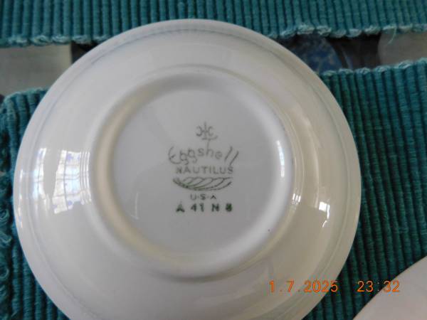 Eggshell Nautilus China, made in the early 1940's in the U.S.A. $50.00, cash only. 30 piece set includes 4 cups and saucers; 6 small bowls, 5"; 6 plates, 10"; 6 dessert plates, 6"; 1 serving platter, 11.5" & 1 serving bowl, 9". Great condition, see photos. Will meet in Columbia. Thanks for looking.