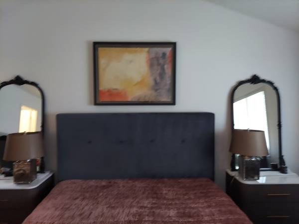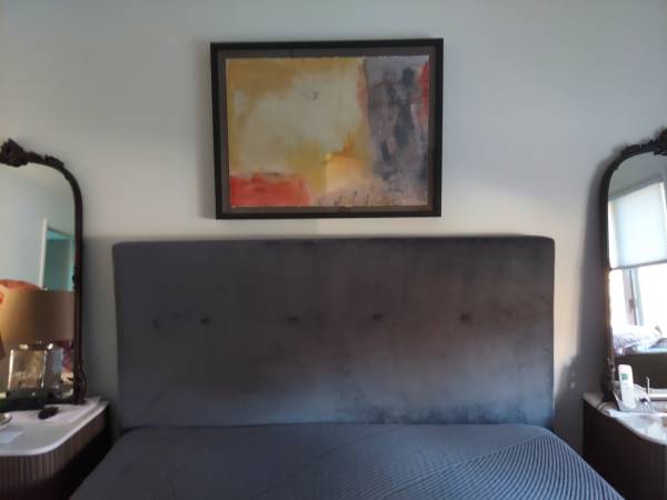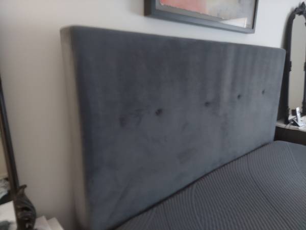 Gray Upholstered king headboard in excellent condition coupled with a metal king bed frame. Also included in the price are 2 table lamps. (One lamp needs a new switch).