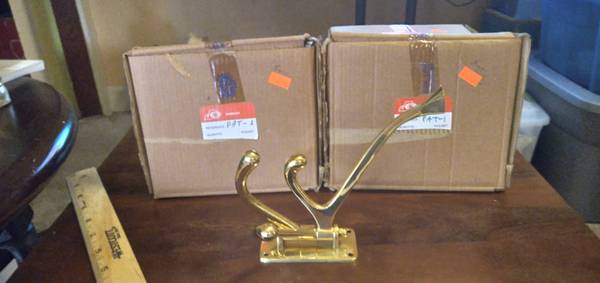 4 Hook 3 way solid brass coat hooks, new still in original package. Beautiful vintage Mid-Century Art Deco Style Solid Brass Nautical Swivel Coat Rack. Perfect for small spaces holding coats, clothing, bathrobes and towels in the bathroom or kitchen. Originally primarily designed for yacht use and that's why all hangers rotate independently at 180 degrees, when not in use it can be folded flat. Easy wall mounting. 11 coat racks, 10 in original package, 1 loose. They are $40 at Walmart. Mine are $15 each or $10 each if you buy all 11.