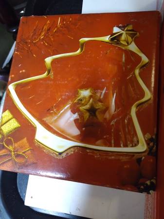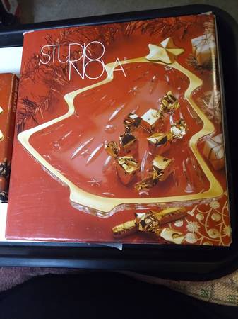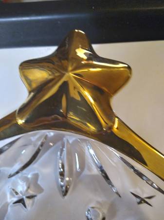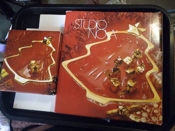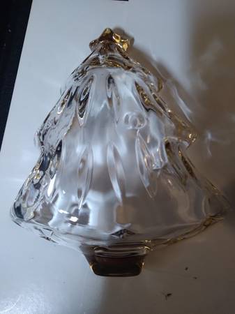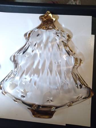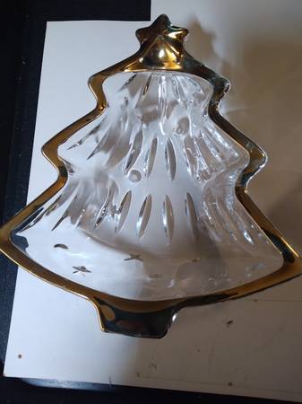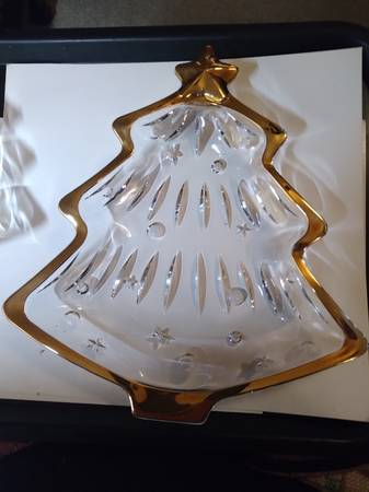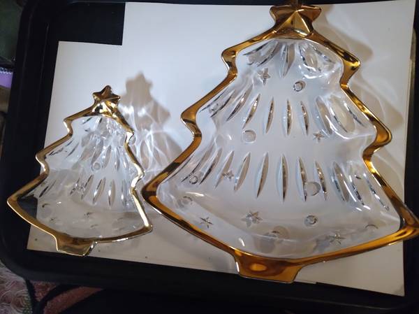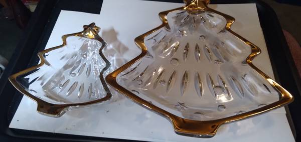 A pair of Studio Nova by Mikasa crystal candy, or what-not dishes. They are in perfect condition, with a tree design and trimmed in gold. One is 6"x5" and the other is 10"x9" High quality glass and are beautiful. Both have original boxes. $30 For Both