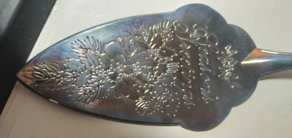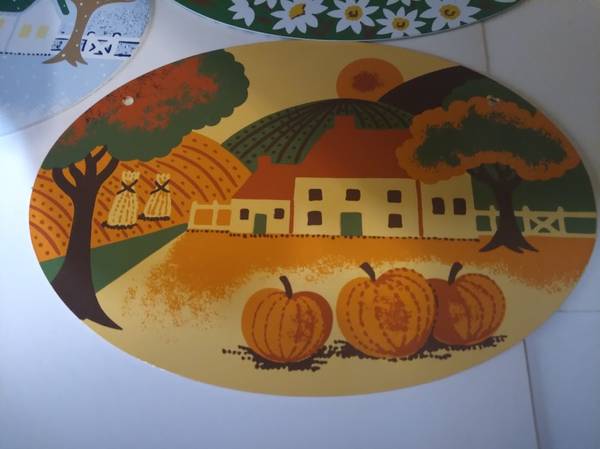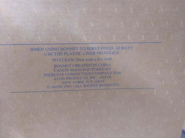 3 items from Avon's "Gift Collection" Vintage 1990s Wicker Hat Basket with a Blue Ribbon with White Polka Dots and a Flower. Avon "Flowers N Bonnet" is in excellent condition. The box says it had candy but I'm afraid that was edible so it's gone. Original box. It has an 8.5" Diameter Brim and the Basket has a 4" Diameter: 3 Avon Door Plaques, should be 4 with something to hang them on (Missing) The other 3 are like new, never used. The hand-painted pictures are the same on both sides, so you can see them coming and going. 6.5"x4.25" Oval: Avon Christmas-Themed pie or cake server. The server is silver-plated, has Holly and a Bow with Season's Greetings above that, the handle has a decorated Christmas Tree with a bow below that. The silver plate has a nice vintage finish. 12" Over-all with server part being 5.5"x3" Only $15 for all 3