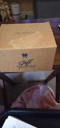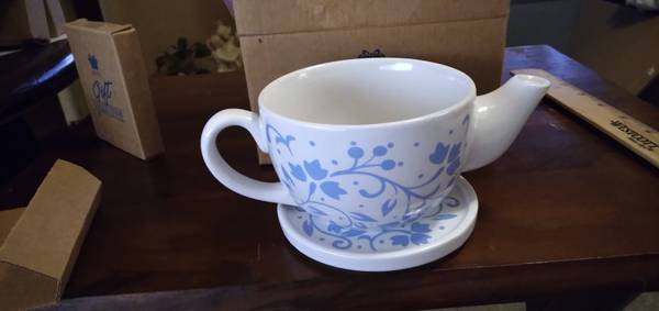 This 1997 Warm & Cozy Teapot Shaped Coffee Mug with a lid/coaster. Features a blue and white floral pattern and is shaped like a teapot. About a 4" diameter and 2.5"-3" tall. It has a lid that can also be used as a coaster. A great collector piece and comes in original box. $15