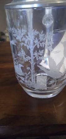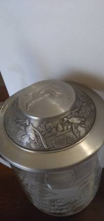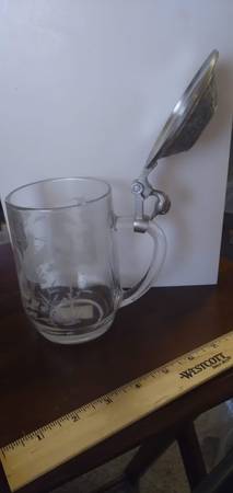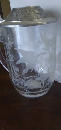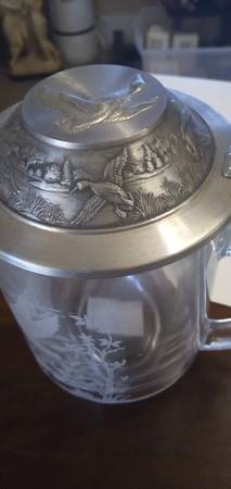 A beautiful clear glass beer stein with a pewter lid, featuring an etched scene of ducks in a waterside setting. The pewter lid also incorporates duck imagery and a duck head lever. The glass blank is from France and the artwork is done in Germany. In like new condition, no cracks, chips, or repairs. About 5.5" Tall $15