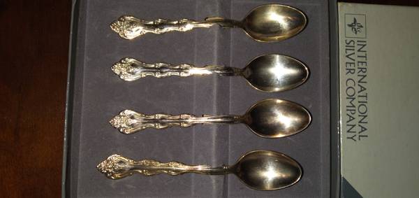 A set of 4 Golden Silver-Plate Teaspoons from The International Silver Company. They have ornate baroque style handles and have a golden finish, still in their original package never used. Look like...