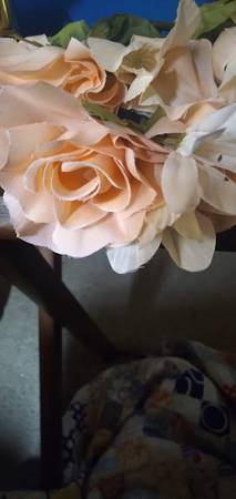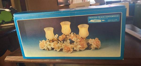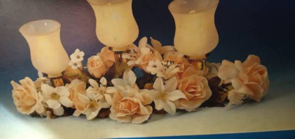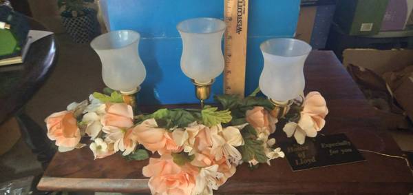 "Frosted Peach Centerpiece" from the "House of Lloyd" a brass stand with three frosted globes and beautiful poly-silk pink roses and smaller white flowers. Candles and flowers have always been symbols of romance. Each poly-silk flower is hand-assembled into the arrangement. First time out of the box was for these pictures. $15