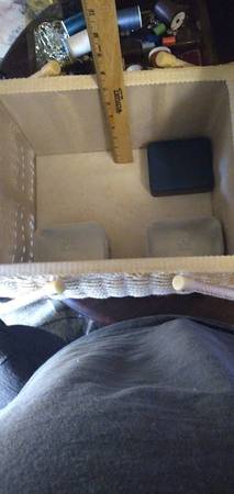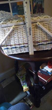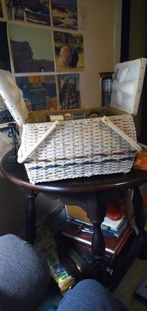 Large Woven Sewing Basket, a retro sewing box 1970s. Wicker - Tapestry style lid. It is in excellent shape made back when they wanted to turn out a well made product. $30