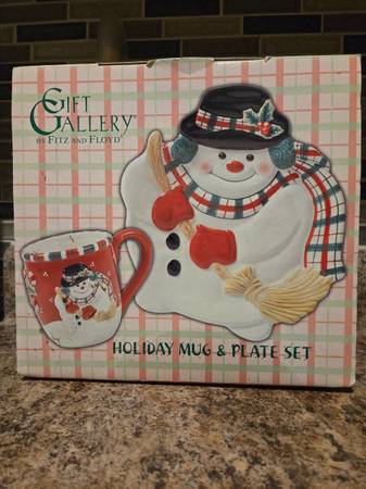 Fitz & Floyd Ceramic Snowman set! NEW in original box: 10" x 10". Plate: 9" x 10" Mug: 20 oz 4 1/2" H x 4" diameter Call/text
