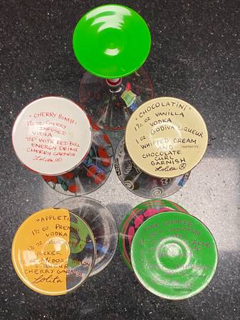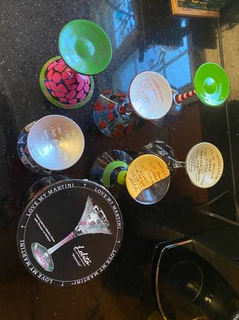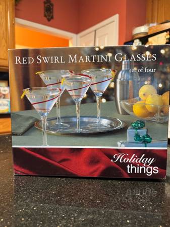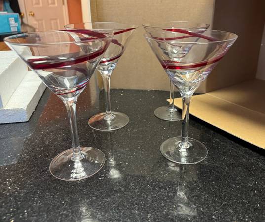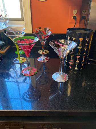 6 Hand painted martini glasses, one that includes the box. All in great condition $4 each or all for $22. Also 2 boxes of 4 (NIB) red swirl martini glasses, take both for $40 or $22 each. Pick up in...
