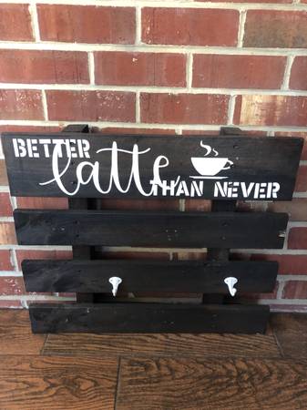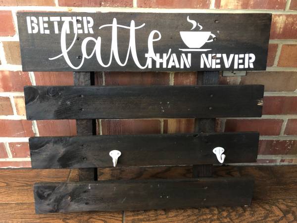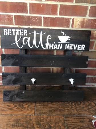 Wall hanging with hooks for coffee mugs. My artist daughter hand crafted this for her coffee bar. She removed some of the hooks, which would be easy to replace.