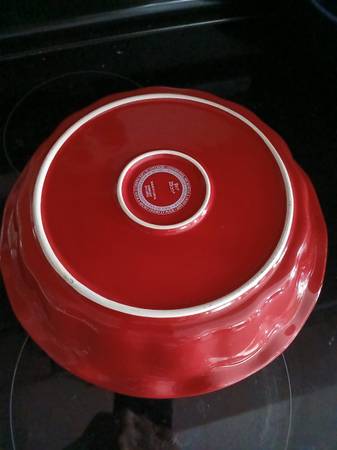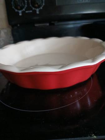 Glazed Fluted Ceramic Pie & Quiche Plate: The Exterior of the pie plate measures 11 inches by 2.25 inches and the inside of the plate measures 9 inches by 2 inches. It is a sizeable plate for making appealing Quiche, Bread Pudding or a Tasty Pie, etc. It is versatile in that it can go directly from the oven to the table. It also can be placed in the Dishwasher, The Microwave or Freezer, withstanding 450 degrees. It is fluted to add appeal to your chosen dish and has a Rubbed & Glazed Ceramic Red Exterior and a White Glazed Interior. Price is $21 or have two for $36. Cash Only & Daylight hours only.. We live in Forest Hill, near Bel Air, Route 1 Bypass , off Route 24 (Harford County).